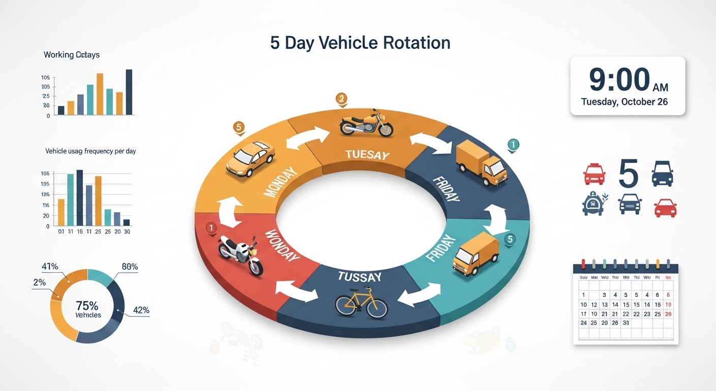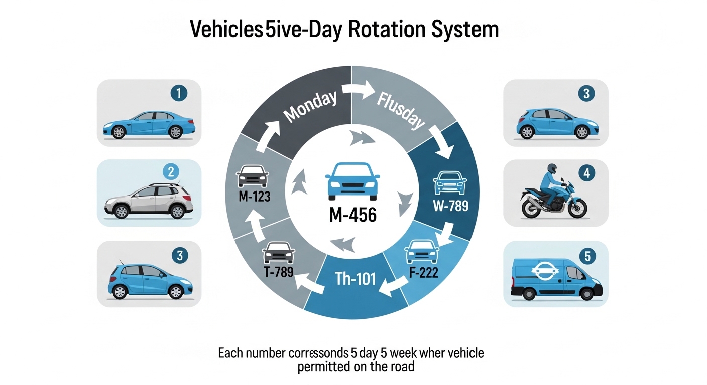 운행 제한은 평일(월~금)에만 적용되며, 주말과 공휴일에는 제한 없이 운행이 가능합니다. 차량 번호판 맨 마지막 숫자에 따른 요일별 제한 기준은 다음과 같습니다.